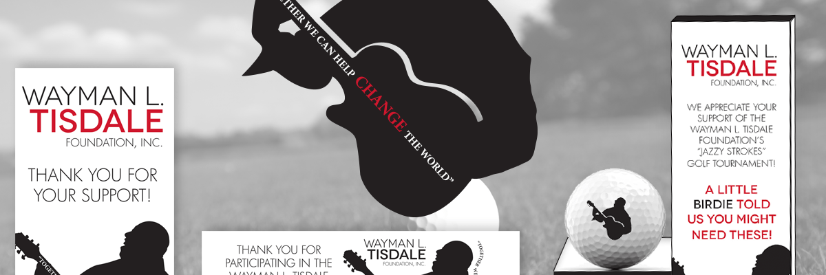 Wayman Tisdale Foundation’s Jazzy Strokes Event Items I love working with non-profit organizations and creating items that I don’t typically get a chance to create. For the Wayman Tisdale Foundation’s Jazzy Strokes Golf Tournament, I had the amazing opportunity to create golf ball sleeves, water bottle labels, a step & repeat, banners, and even the new logo for the event! Take a look below at all the items. If you are interested in learning more about the Wayman Tisdale Foundation and their mission, visit waymantisdale.org. Banners and Step & Repeat Water Bottle Labels & Golf Ball Sleeves