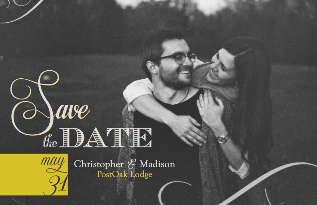 Madison wanted something romantic for her save the dates with lots of swirls and a pop of color. She often wore this beautiful shade of mustard yellow so we decided to make that the statement color for the front of save the date.